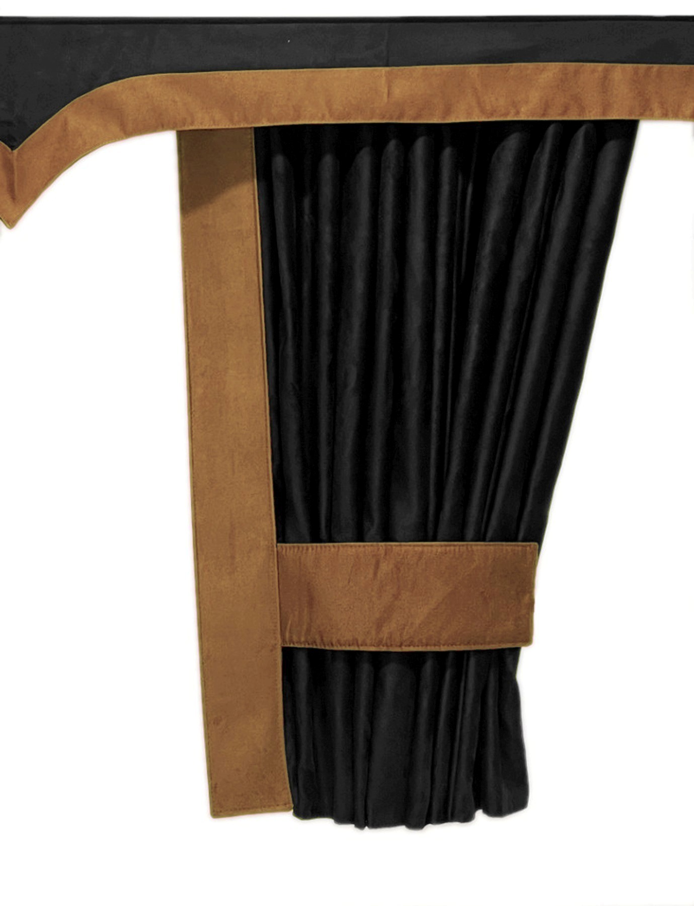 Gardinen sind doppellagig, handgefertigt und verdunkelnd. Anbringung durch einfache Montage.